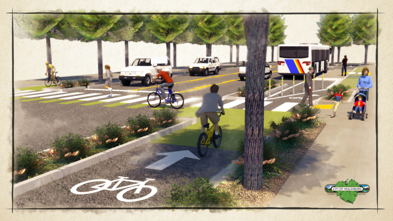Biking is another major focus of the project. Whether you're a casual cyclist or a daily commuter, these enhancements are going to be a huge improvement. First of all, continuous bike lanes will be established, eliminating abrupt endings and ensuring a smooth and uninterrupted ride for cyclists without getting squeezed by the two lanes of traffic which is what happens as things currently stand. To further improve safety, intersections will be specifically designed to reduce conflicts between cyclists and vehicles, making biking a safer mode of travel for everyone which can only help reduce car usage especially as electric bikes become more popular. The project will also enhance connections to existing and planned Foss Creek trails, making it easier for cyclists to move around Healdsburg only on dedicated cycle lanes. Additional bike amenities, such as more bike racks and storage lockers, will also be installed, providing secure parking options for cyclists. While a reduction in carbon emissions and reduced car use is not necessarily a stated goal, these changes are designed to encourage more people to consider biking as a convenient and enjoyable way to get around Healdsburg. These changes will go some way to promoting biking as a viable and attractive transportation option around Healdsburg.